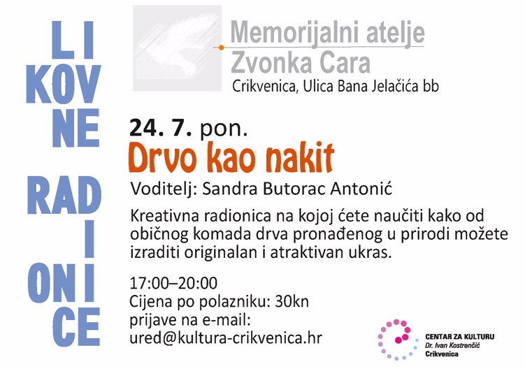 Danas od 17 do 20 sati u memorijalnom ateljeu Zvonka Cara u Crikvenici održat će se kreativna radionica “Drvo kao nakit”. Voditeljica je Sandra Butorac Antonić.