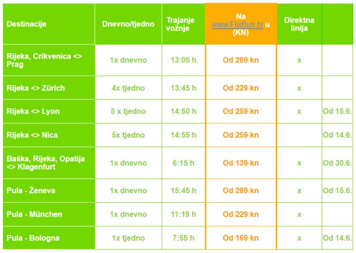 Sve veze i dostupne destinacije iz Istre i Kvarnera te frekvencije polazaka mogu se provjeriti na https://www.flixbus.hr/ i niže u tabeli.