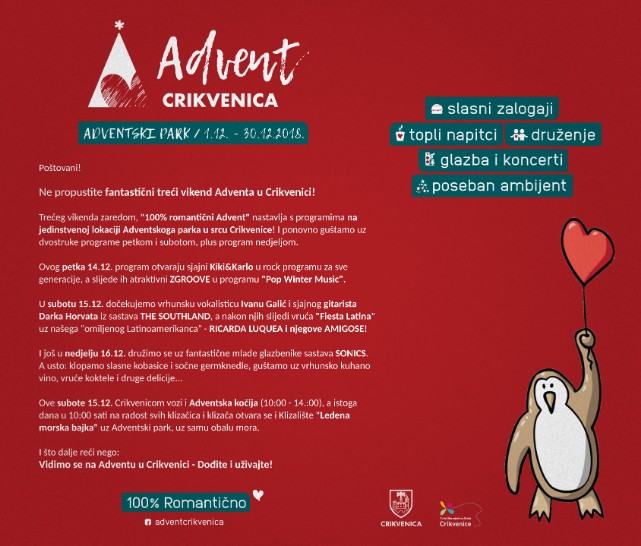 Trećeg vikenda zaredom, “100% romantični Advent” nastavlja s programima na jedinstvenoj lokaciji Adventskoga parka u srcu Crikvenice.