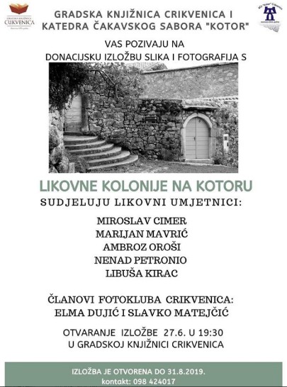 Gradska knjižnica Crikvenica i Katedra čakavskog sabora “Kotor” vas pozivaju na donacijsku izložbu slika i fotografija s likovne kolonije Na Kotoru. Otvaranje izložbe 27.06.2019. u 19:30 sati.