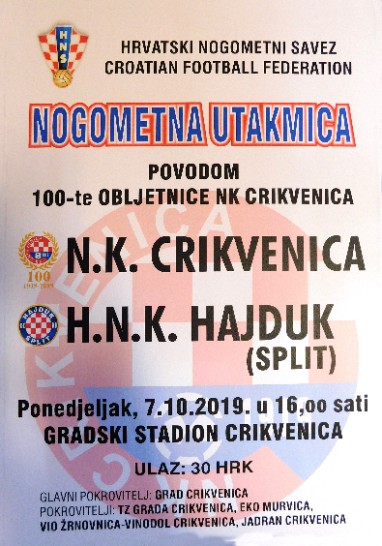 Utakmica između nogometaša “Crikvenice” i “Hajduka” igra se na Gradskom stadionu u ponedjeljak 7. listopada s početkom u 16:00 sati.