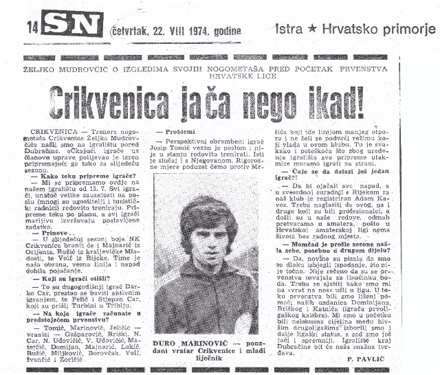 Pripreme su započeli pouzdani Marinović, braniči – eksplozivni Udovičić i svestrani veteran Gašparović, dva centarhalfa Lakić i Majnarić, a Domijan će, kad se oporavi, igrati u vezi s Ružićem, Zoričićem i Borovčakom. U vršku napada igrat će Volf i Ivančić, tako je sustav 4-4-2 najavio trener Mudrovčić. Treneru su na raspolaganju bili i Z, Tomić, Jeličić, M. Matejčić, N, Car, Kavaz, Miljković, Mršić, Tomašić, Filipović i Tomić a u  rujnu iz vojske su se vratili Tomašić i I. Matejčić.  Trener juniora je postao veteran Darko Car, a imao je 28 igrača i 35 pionira. Odigrano je nekoliko prijateljskih pripremnih utakmica i gotovo sve su dobivene te se koncem kolovoza 1974. godine vjerovalo da u novoj sezoni opstanak neće doći u pitanje. U ligu je i pristigao stari znanac Nehaj, a ždrijeb je odlučio da se prva Nehajeva utakmica odigra u Senju protiv Crikvenice. U Senju dugo nije vladalo takvo sportsko uzbuđenje, tako da su ulaznice za utakmicu prodavane tijekom tjedna (3.000), a igrači Nehaja su bili u tzv. karanteni. Toga 25. kolovoza 1974. godine su iskusniji Crikveničani postigli tri pogotka podno Nehaja, a Senjani jedan. Ivančić, često koban za Senjane, postigao je dva pogotka. Igralo se fer i sportski kao nikada do tada, što je svakako bio najveći dobitak ovoga derbija, napisao je igrač i izvjestitelj s ove utakmice, Aleksandar Atanasić. Nakon ove pobjede je slijedio red poraza pa pobjeda. U II. kolu je gostovao u Crikvenici Metalac iz Siska i na iznenađenje svih, pa i njih samih, pobijedili su s 2 : 0. U Metkoviću je slavila Crikvenica s 1: 0 iz odlično izvedenoga slobodnog udarca Majnarića s 25 metara. Borovčani su u Crikvenici pružili žestok otpor sve do 76. minute, kad je Kavaz postigao jedini zgoditak na utakmici. Susret drugog i trećeg na tablici Solina i Crikvenice završio je 3 : 1. Bio je to nesretan i nezaslužan poraz, ali to je nogomet. Dubrovački GOŠK se pored Dubračine sam pobijedio zabivši autogol. U GOŠK-u je, dok je studirao u Dubrovniku, igrao  vođa navale Crikveničana Zdenko Ivančić, a postao je i dubrovački zet. Da je barem bilo moguće preskočiti putovanje u Slavonski Brod u VII. kolu. Naime, prvu pobjedu su domaći postigli baš protiv Crikvenice  (3:2).