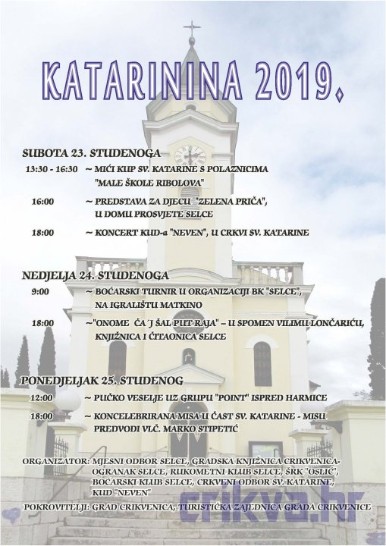U subotu 23. studenoga na rasporedu je natjecanje u ribolovu za djecu „Mići kup sv. Katarine“ koje počinje u 13:30 sati i traje do 16:30. Za najmlađe je u Domu prosvjete Selce predviđena predstava „Zelena priča“ s početkom u 16:00 sati. Koncert KUD-a „Neven“ održat će se u crkvi sv. Katarine s početkom u 18:00 sati.
