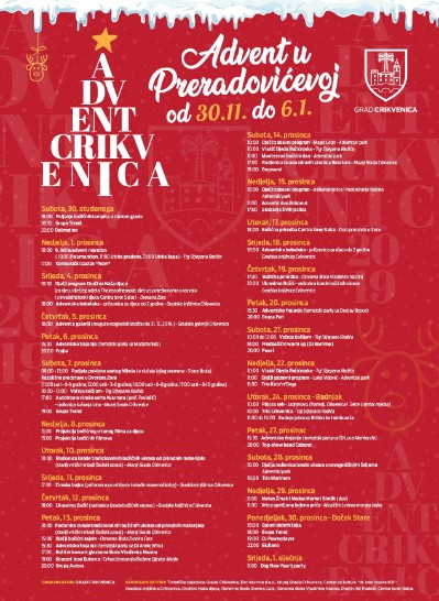 Za sva predviđena događanja, u slučaju lošeg vremena, obavijest o promjeni lokacije ili promjeni termina bit će objavljena na službenoj web stranici Grada Crikvenice (www.crikvenica.hr) i Facebook stranici Advent Crikvenica.