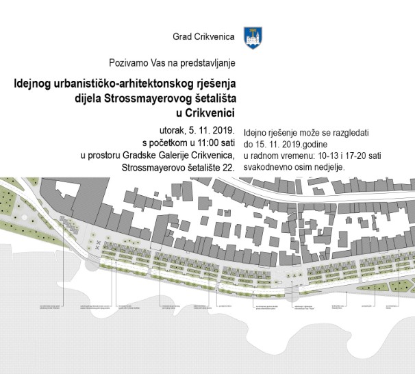 U utorak 5.11.2019. s početkom u 11:00 u prostoru Gradske galerije Crikvenica (Strossmayerovo šetalište 22) održat će se predstavljanje Idejno-urbanističko-arhitekstonskog rješenja dijela Strossmayerovog šetališta u Crikvenici. Idejno rješenje moći će se razgledati do 15.11.2019. u radnom vremenu od 10 do 13 i od 17 do 20 sati.