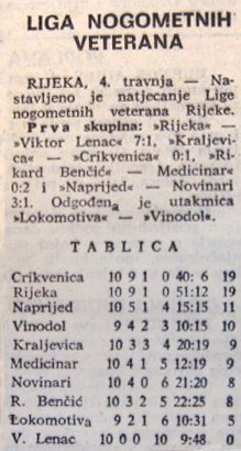 U ligi veterana, u kojoj su igrali igrači koji su prestali aktivno igrati, kao što su Tomić, Gašparović, Briški, M. Matejčić i Domijan, su u listopadu 1977.g. vodili na veteranskoj tablici.