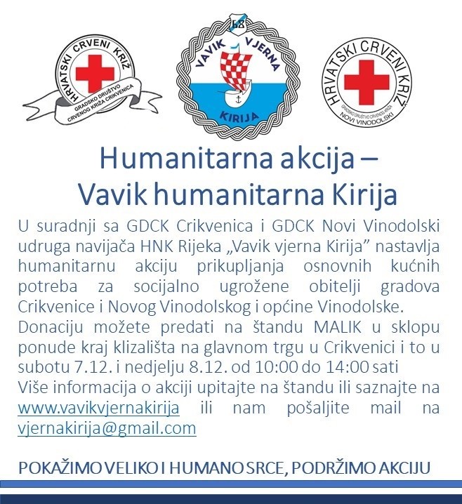 Donacije je moguće predati i u beach baru “Figa” kraj plivališta, caffe baru “Galapagos” na Hrusti u Crikvenici i u pivnici „Nill“ u Novom Vinodolskom i to sve do kraja akcije 12.12. Više detalja o samoj akciji pronađite na www.vavikvjernakirija.com.
