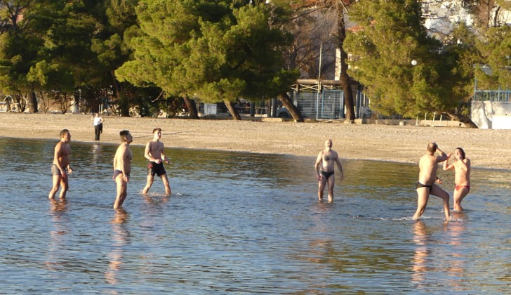 Na svega 11℃ zraka i 10℃ mora novogodišnji picigin su zaigrali Saša Mužević, Ivica Manestar, Denis Vičić, Darko Kurtović, Renato Smolčić i Željko Smolčić
