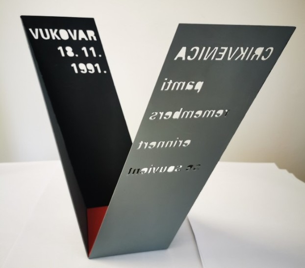 Osnovna ideja umjetničkog rješenja, koje je od strane Ocjenjivačkog suda ocijenjeno kao prvo rangirano, je „Vječni Plamen“. Umjetničko rješenje sastoji se od dvije željezne forme obojene u crnu i sivu boju koje omeđuju crveni kvadrat, tvore slovo V kao Vukovar, Victory i na njima je probijen tekst: Vukovar 18.11.1991. i Crikvenica – pamti (prevedeno na strane jezike) – remebers – erinnert – se souvient. Forma je osmišljena tako da se iz svakog kuta može raspoznati slovo V.