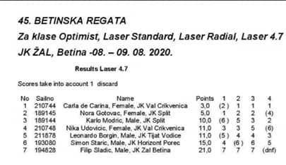 Puno peha imala je Ursula Balas koja je nakon brojnih nedaća s opremom (pucanje dijelova jarbola) na kraju zauzela 7. mjesto u ovoj klasi. Dobar rezultat postigla je i Nika Udovičić plasiravši se na 4. mjesto u klasi Laser 4.7. Crikveničke jedriličare je u Betini vodio trener Sven Katnić.