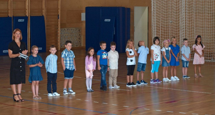 U OŠ Zvonka Cara prvašići su dočekani u sportskoj dvorani uz riječi dobrodošlice ravanateljice Desiree Pečaver.