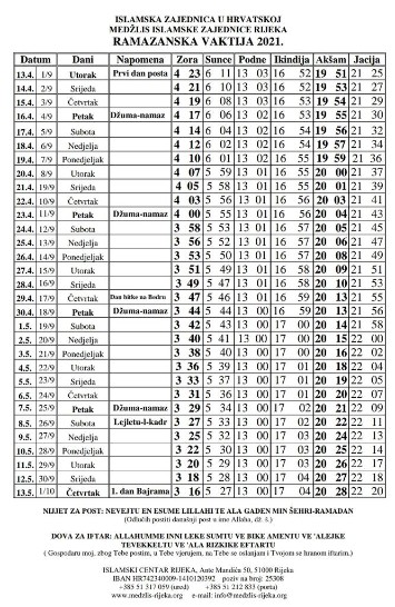 U većini država svijeta muslimanski mjesec posta Ramazan počinje u utorak, 13. travnja. a prvi teravih-namaz se klanja dan prije odnosno za područje Kvarnera to je 12. travnja u 19:50 sati, jer hidžretskom kalendaru novi dan nastaje zalaskom sunca.