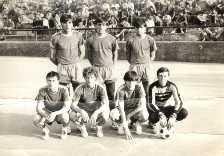 Sjajna malonogometna ekipa na senjskom Tenisu: Ivan Smojver, Miroslav Vukić, Damir Vukić (stoje), Ivica Butorac, Branko Bosančić, Ivica Knežević i Vladimir Savić