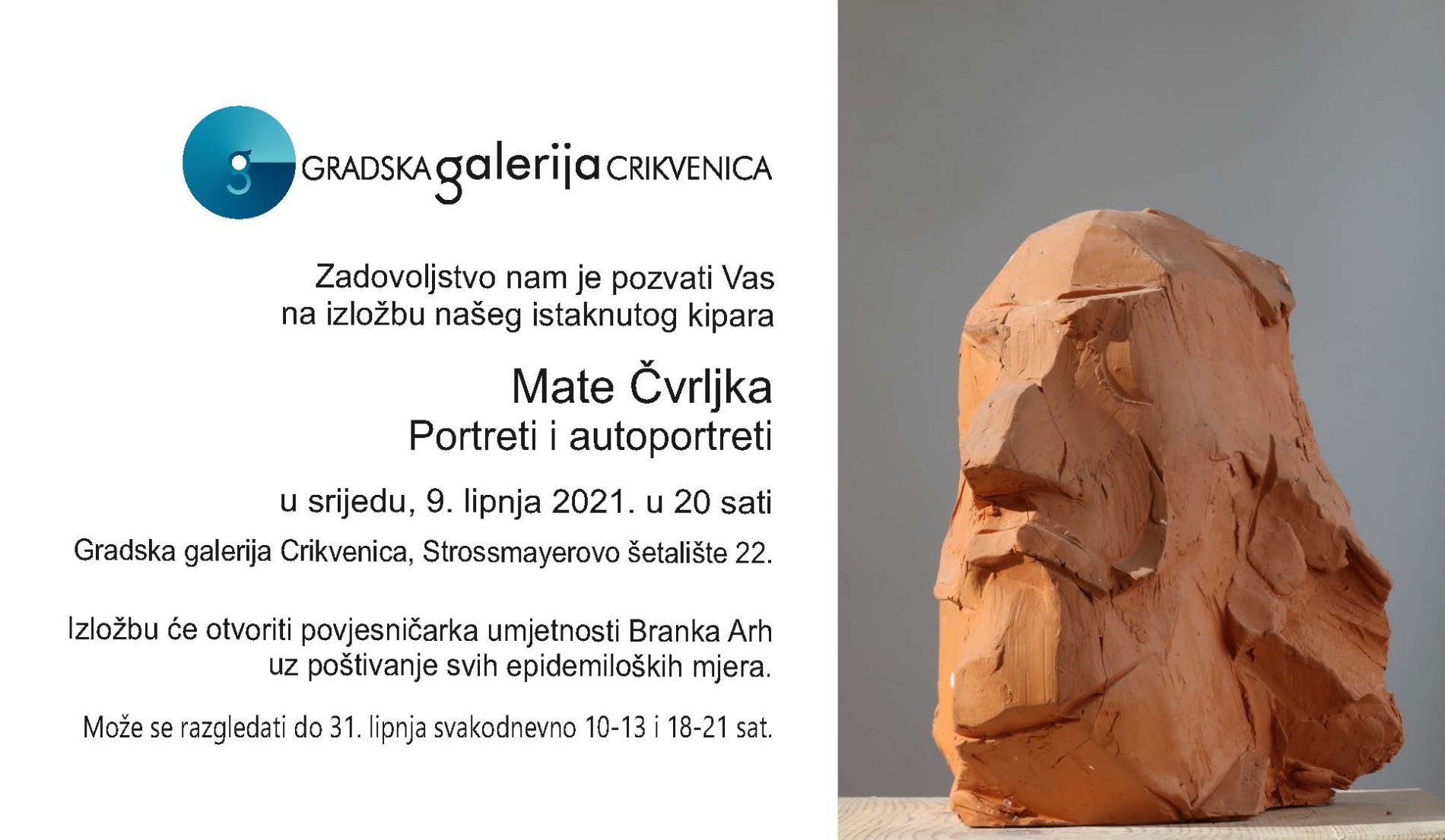 U srijedu 9.6. u 20 sati u Gradskoj galeriji Crikvenica otvara se izložba kipara Mate Čvrljka “Portreti i autoportret”.