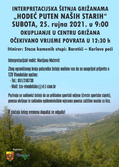 Jedno od najljepših dijelova Vinodolskog kraja, ovog puta dijela „Staze kamenih stupi“ od Baretića do Karlovih peći možete upoznati kroz Interpretacijsku šetnju pod nazivom: