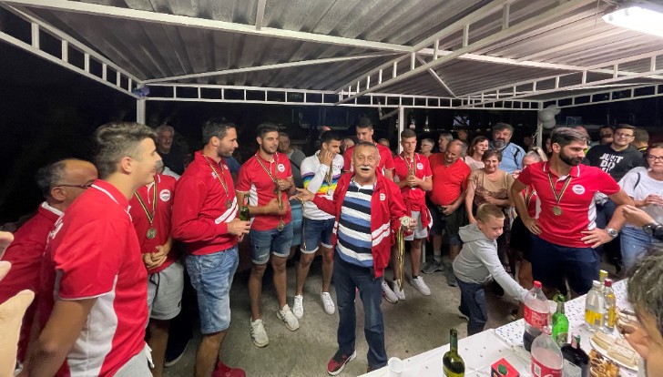 Fešta je potrajala do dugo u noć, veseli dečki iz Gornjeg kraja, uz Davora Ivčića i Valtera Ahela, držali su tempo sve dok umorni boćari, koji su od Martiguesa do Jadranova prevalili 1.040 kilometara nisu otišli na počinak.