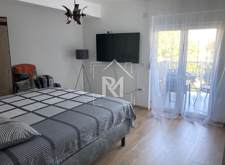 Stan ima i balkon sa predivnim pogledom na centar grada i more. Stan se nalazi na lokaciji koja pruža blizinu svih sadržaja, a pogodan je za cjelogodišnje ili sezonsko stanovanje.
