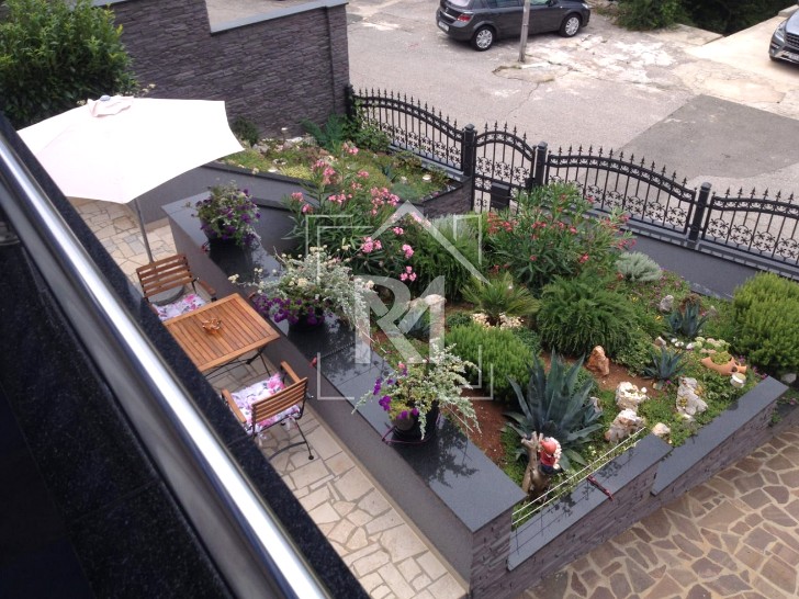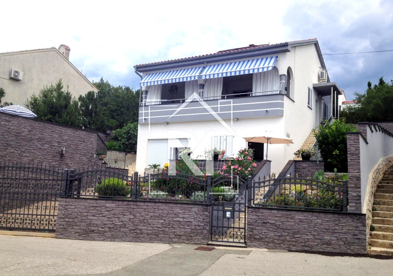 Kuća renovirana 2002. godine na mirnoj i tihoj lokaciji. Sastoji se od dva odvojena stana. Jednosoban stan je u prizemlju i ima izlaz na terasu. Na prvom katu je dvosoban stan sa balkonom i predivnim pogledom na obližnje otoke. Okućnica ukljućuje roštilj, mjesto za sjedenje, vanjski tuš. Vrt i dvorište potpuno su i vrlo detaljno uređeni. U garažu stanu dva auta, a krov garaže pretvoren je u terasu.