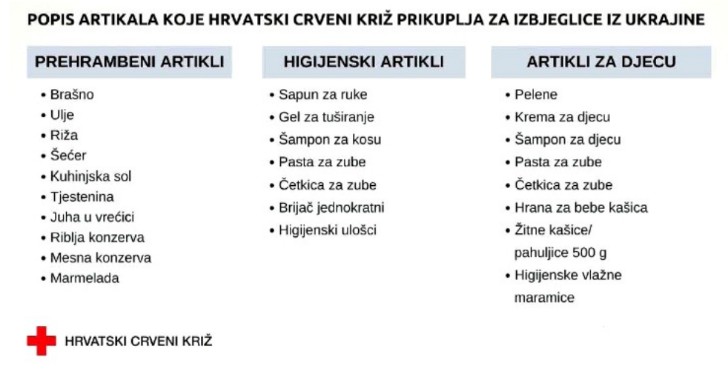 Razrednici prikupljaju za svoj razredni odjel na satu razrednika, a suradnici Gradskog društva Crvenog križa rasporedit će pomoć potrebitima. prikupljaju se SAMO artikli s popisa, ostalo se neće preuzimati.