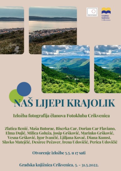 U četvrtak 5.5. u 17 sati ispred Gradske knjižnice Crikvenica bit će otvorena izložba Fotokluba Crikvenica “Naš lijepi krajolik”. Izložba će se moći razgledati do kraja mjeseca svibnja.