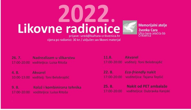 Tijekom kolovoza će se u organizaciji Centra za kulturu “Dr. Ivan Kostrenčić” Crikvenica u Memorijalnom ateljeu Zvonka Cara u Crikvenici održavati zanimljive likovne radionice.