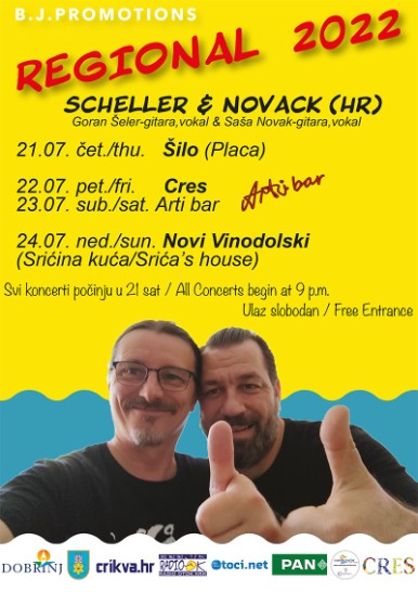 Regional 2022 se u četvrtak 21.7. nastavlja mini turnejom dvojca Scheller & Novack i to prvo u na Placi u Šilu, u petak 22. i u subotu 23.7. u Arti Bar Cres, te u Srićinoj kući u Novom Vinodolskom u nedjelju 24.7.