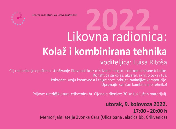 Cijena radionice (uključen materijal) je 30 kuna, a prijaviti se možete na e-mail: ured@kultura-crikvenica.hr Likovnu radionicu organizira Centar za kulturu “Dr. Ivan Kostrenčić”.