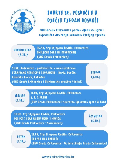 Dječji tjedan je počeo u ponedjeljak, 3. listopada 2022., Međunarodnim danom djeteta. Zajednička tema ovogodišnjeg Dječjeg tjedna je igra, a aktivnosti će se provoditi pod nazivom “Zavrti se, poskoči i u Dječji tjedan doskoči”. Tim povodom DND Grada Crikvenice poziva djecu na igru i zajedničko druženje.