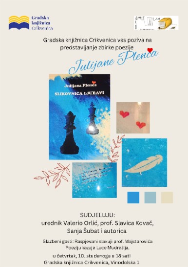 U sklopu Mjeseca hrvatske knjige Gradska knjižnica Crikvenica organizira u četvrtak, 10. studenoga predstavljanje nove zbirke poezije Julijane Plenča Slikovnica ljubavi.