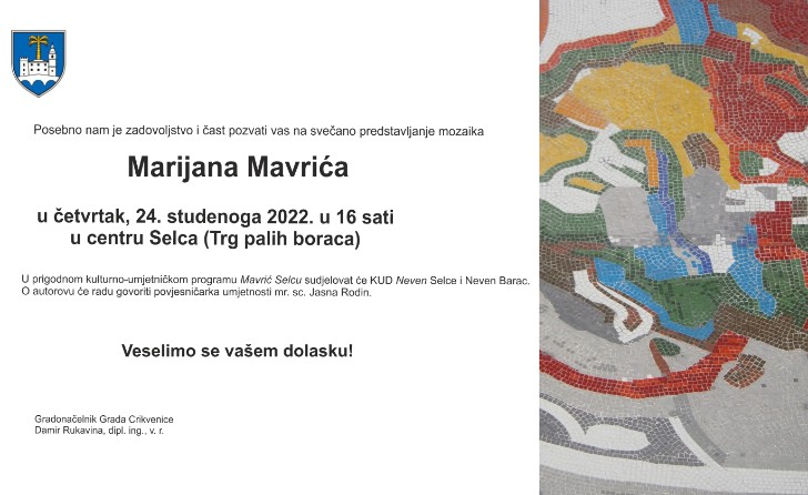 U četvrtak 24. studenoga u 16 sati u centru Selca bit će svečano predstavljan mozaika slikara Marijana Mavrića.