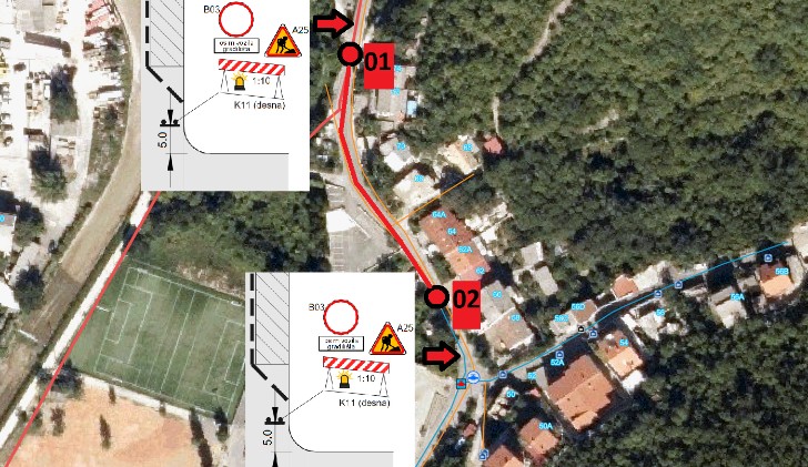 U vremenskom razdoblju od 7:00 do 15:00 sati predmetna dionica zatvara se za promet motornih vozila. Zauzeće kolnika vršit će se prema napredovanju radova povremenim izmještanjem branika i zaštitne ograde u vrijeme izvođenja radova te će pješački prilaz obiteljskim objektima biti osiguran.