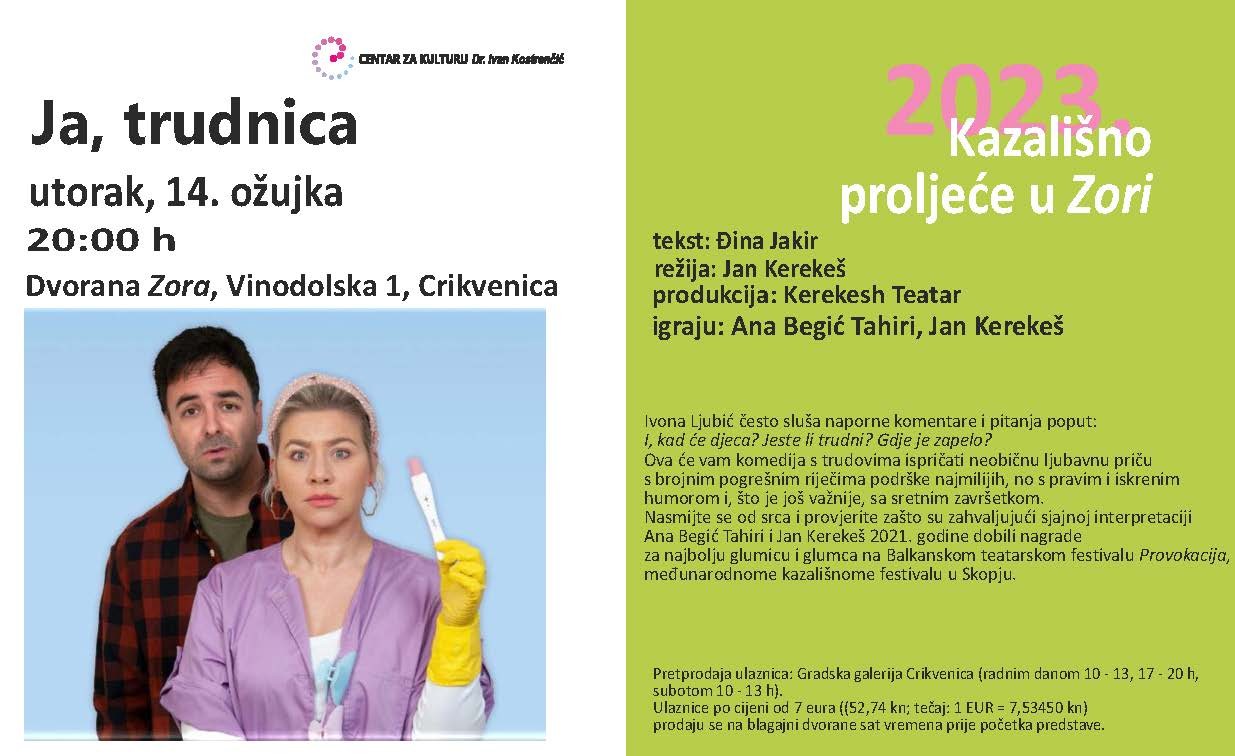 U utorak, 14. ožujka u 20 h posjetitelje crikveničke dvorane “Zora” očekuje sjajna predstava “Ja, trudnica” u produkciji “Kerekesh teatra”.