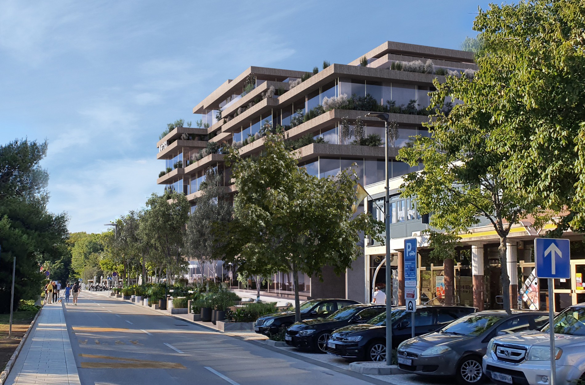 Hotel International u središtu Crikvenice danas ne ispunjava sve zahtjevnije standarde smještaja i pružanja usluga gostima primjerenima svojem potencijalu. Građevinski je dotrajao te je jedino rješenje sveobuhvatna rekonstrukcija. Nova uvučena baza hotela će zadržati dvije postojeće etaže izvornog oblikovanja hotela, iznad kojih će se formirati novi transparentni prostori smještajnih jedinica. Takvim će se oblikovanjem uklopiti u urbanistički kontekst središta Crikvenice. U najvećem dijelu će građevina biti ozelenjena po obodu svih etaža i po zelenim krovovima s različitim raslinjem koje pripada lokalnom podneblju. U prizemlju hotela nalazit će se slastičarnica, lobby i restoran s terasama na trgu. Kultna crikvenička kavana Inter zadržat će svoje mjesto na radost svih svojih gostiju. U planu je i ponovno vraćanje u funkciju danas zatvorenog prolaza koji spaja sjeveroistočnu i jugozapadnu stranu hotela. U urbanističkom pogledu bit će to povratak izvornom projektu hotela, a otvaranjem prolaza spojit će se s Preradovićevom ulicom. Iz tog novouređenog prolaza ulazit će se u poslovne prostore u prizemlju i na galeriji, a predviđeni su pokretne stepenice i dizala za pristup gornjoj etaži galerije.