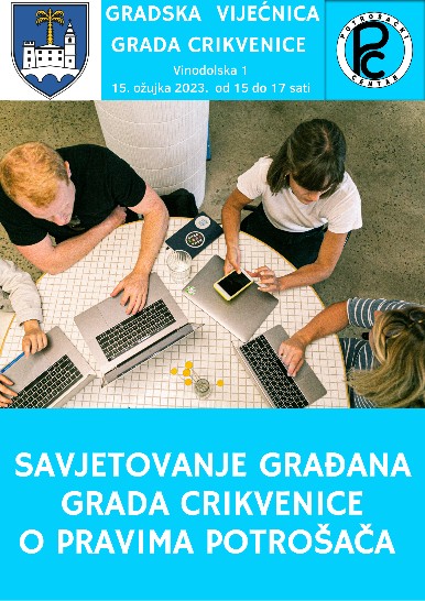 Udruga Potrošački centar provodi savjetovanje građana o pravima potrošača. Jedno takvo savjetovanje održat će se u srijedu 15.3.2023. u crikveničkoj Gradskoj vijećnici (Vinodolska 1), po sljedećem rasporedu: