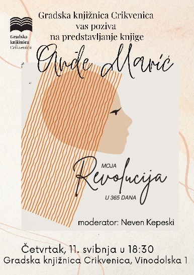Gradska knjižnica Crikvenica vas poziva na predstavljanje knjige Anđe Marić “Moja revolucija u 365 dana” u četvrtak, 11. svibnja 2023. u 18:30 u prostoru knjižnice, Vinodolska 1.