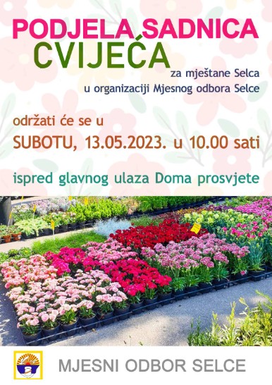 Također, u organizaciji Mjesnog odbora Selce u subotu 13. svibnja mještanima Selca dijelit će se ukrasne sadnice. Podjela sadnica počinje u 10 sati ispred glavnog ulaza Doma prosvjete. Sadnice su besplatne.