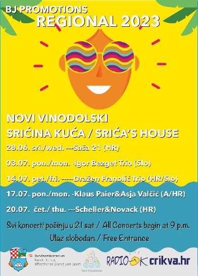 BJ Promotions u suradnji s kolegama iz CZK Novi Vinodolski, TZO Dobrinj i uz potporu PGŽ i austrijskog Ministarstva kulture ponosno predstavlja 8. Međunarodni glazbeni festival „Regional 2023“