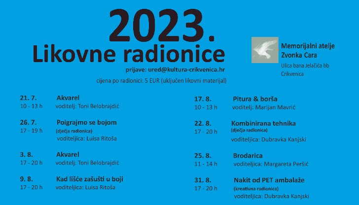 Tijekom srpnja i kolovoza će se u organizaciji Centra za kulturu “Dr. Ivan Kostrenčić” Crikvenica u Memorijalnom ateljeu Zvonka Cara u Crikvenici održavati zanimljive i raznovrsne likovne radionice