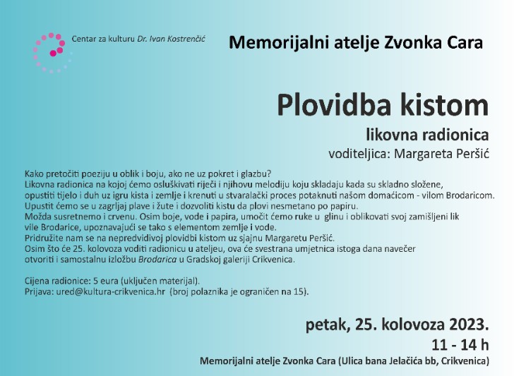 U petak, 25. kolovoza 2023. posjetitelje Crikvenice očekuje jedno nesvakidašnje audio-vizualno putovanje pod vodstvom umjetnice Margarete Peršić. U 11 h će u Memorijalnom ateljeu Zvonka Cara u Crikvenici početi zanimljiva likovna radionica “Putovanje kistom” (obavezne su prethodne prijave na: ured@kultura-crikvenica.hr).