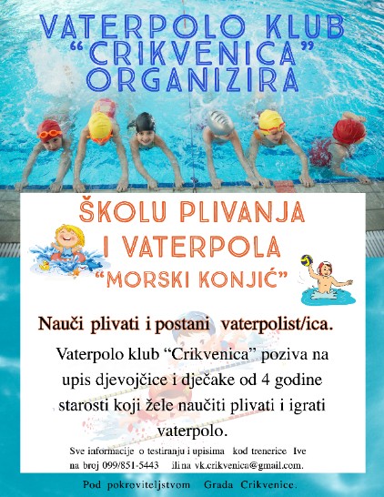 Vaterpolo klub “Crikvenica” želi oformiti ekipu vaterpolskih “mlađih nada”, tako da ovim putem pozivamo sve djevojčice i dječake u dobi od 4 godine i starije da nam se pridruže. Uz vodstvo trenerica Ive Valerie Ornik i Bianke Marie Ornik djeca će usvajati osnove održavanja na vodi, kretanja kroz vodu i plivanja.