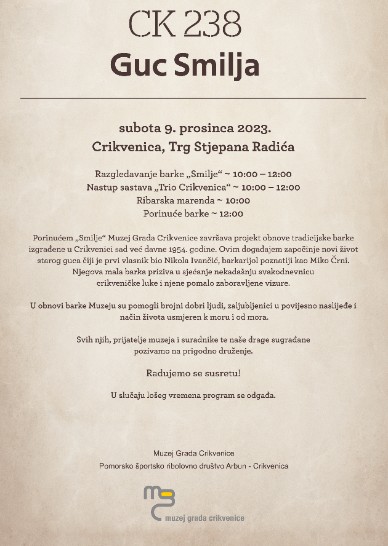 Danas je od 10,00 do 12,00 sati, Muzej Grada Crikvenice pripremio kratki program prilikom porinuća naše obnovljene drvene barke. Guc Smilja CK 238 moći će se razgledati u subotu ujutro u crikveničkoj gradskoj luci, a porinuće je planirano u 12,00 sati: