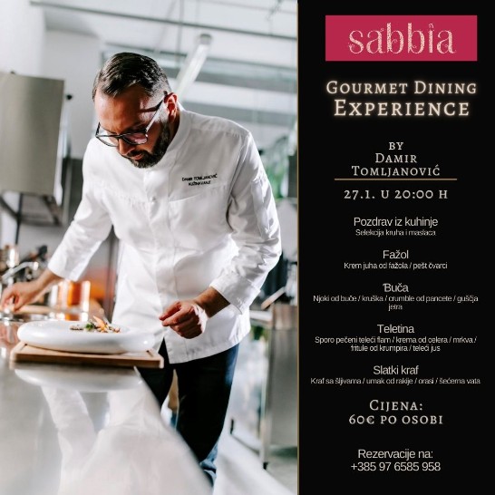 Večeras u “Sabbiji” gostuje poznati chef Damir Tomljanović koji je za ovu prigodu pripremio jedinstven meni. Renomirani chef s dugogodišnjim iskustvom rada u brojnim vrhunskim restoranima i jedan od omiljenih žirija showa “Masterchef”, osmislio je jela među kojima će se pronaći mirisi i okusi koji aromom privlače sve.