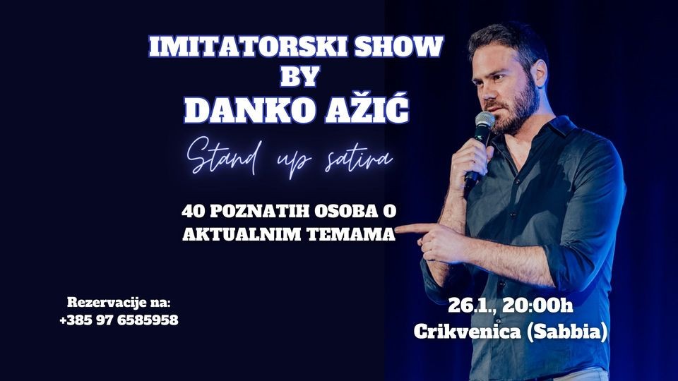 Jedinstveni show u kojem se satiričar i imitator Danko Ažić iz perspektiva 40 poznatih osoba na zabavan način osvrće na razne aktualne teme koje nas muče zadnjih godina. Od novonormalnog do raznih poskupljenja, AI umjetne inteligencije i društveno-političke neinteligencije – sve navedene teme obrađene kroz parodiju, imitacije, satiru i improvizaciju imat ćete priliku čuti i vidjeti 26.1. (petak) od 20h u Crikvenici (“Sabbia” restaurant, pizzeria & bar).