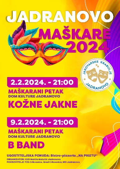 Jakovarske krabulje večeras u Domu kulture organiziraju popularnu (i tradicionalnu) maškaranu zabavu petkom. Jakovarima će u goste doći Mesopustari Kraljevice, Mantinjada Selce, Šmričke mačkare, Čočman Express, UZNO Gornji kraj,Bribirska parada, Parada Duga i Krabulje Drivenik.