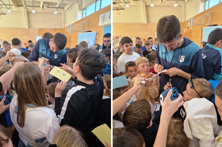 Poklonom su nagrađeni slavljenici Deni Gajdek i Karlo Lončarić, a najveća navijačica među djevojčicama – Neva Kostrenčić koja s mamom Anom odlazi i na gostovanja omiljenog kluba, imala je prigodu fotografirati se sa svim igračima. Druženje je završeno uz podjelu autograma i fotografiranje učenika s nogometašima.