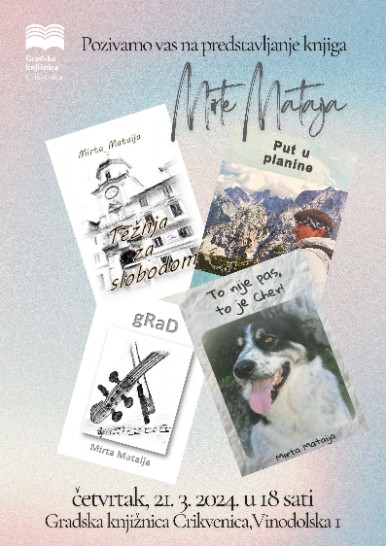 Gradska knjižnica Crikvenica poziva na predstavljanje knjiga Mirte Mataija u četvrtak (21.3.) u središnjem odjelu, Vinodolska 1 s početkom u 18 sati.
