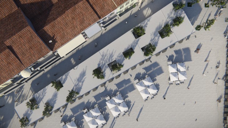Sanacijom će se ukloniti drvene grede i postaviti čelična konstrukcija, koja će se zaštititi dodatnim premazom. Problem oborinske odvodnje riješit će se korištenjem zelenih otoka s postojećim visokim raslinjem. Na taj će se način optimizirati rast stabala dodatnim navodnjavanjem, te smanjiti otjecanje kiše po samom trgu. Sve će u konačnici pridonijeti postizanju vizualne usklađenosti terasa ugostiteljskih objekata.