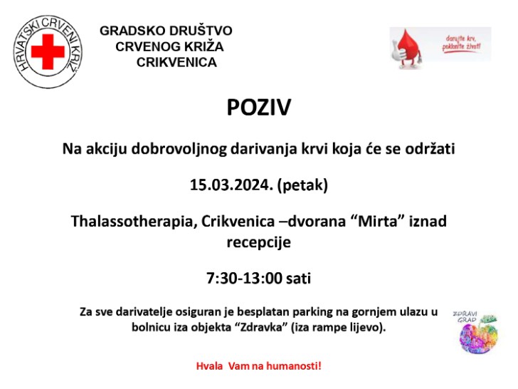 Akcija će se održati u prostoru Thalassotherapije, Crikvenica – dvorana „Mirta“ iznad recepcije, u u petak 15.3.2024. od 7:30 do 13:00 sati.