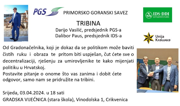 U srijedu s početkom u 18:00 sati u Gradskoj vijećnici Grada Crikvenice (stara škola) održat će se predizborna tribina na kojoj će sudjelovati Darijo Vasilić, predsjednik Primorsko-goranskog saveza, Dalibor Paus predsjednik Istarskog demokratskog saveza i Marko Boras Mandić, predsjednik Unije Kvarnera