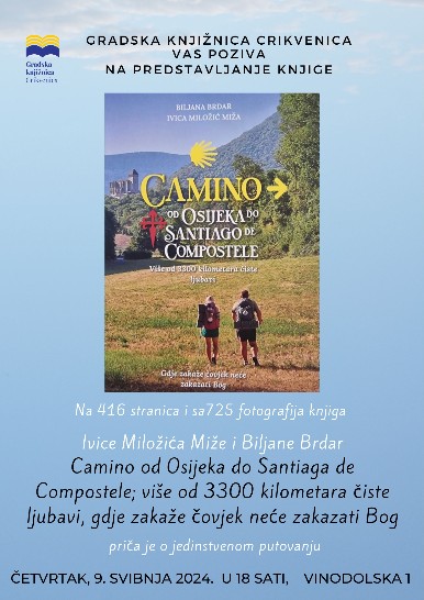 Gradska knjižnica Crikvenica poziva na predstavljanje knjige Od Osijeka do Santiago de Compostele Ivice Miložića Miže i Biljane Brdar u četvrtak, 9. svibnja u središnjem odjelu, Vinodolska 1 s početkom u 18 sati. Ulaz je slobodan.